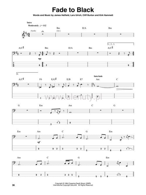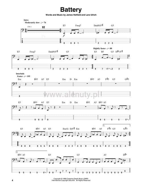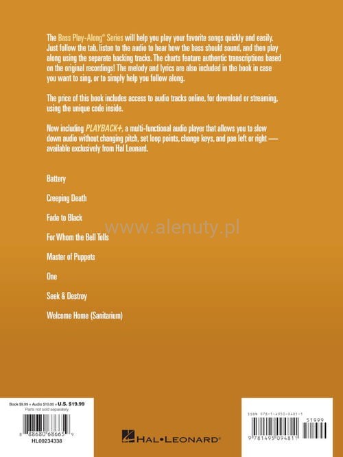 Nuty na gitarę basową z tabulaturą ośmiu popularnych piosenek zespołu Metallica z lat 1983-1988. W cenie publikacji jest dostęp do nagrań utworów i podkładów muzycznych na stronie internetowej wydawcy.
