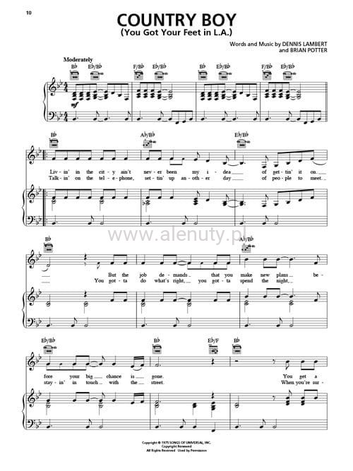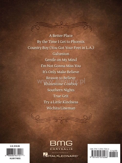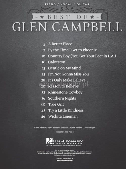 Nuty na fortepian, głos i gitarę (PVG) 13 najpopularniejszych wybranych utworów gitarzysty country Glen'a Campbell'a. Wydania oznaczone jako PVG (Piano Vocal Guitar - Fortepian Melodia Gitara) zawierają zapis nutowy linii melodycznej, nuty na fortepian, akordy gitarowe oraz słowa do piosenek zamieszczonych w publikacji. Więcej o nutach PVG przeczytasz >>> w artykule