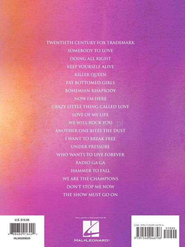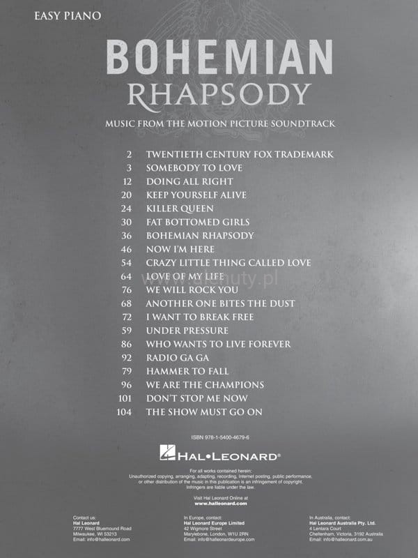 Bohemian Rhapsody to kronika podróży legendarnego zespołu rockowego Queen i jego kultowego wokalisty Freddiego Mercury'ego. Ten śpiewnik zawiera 20 piosenek Queen ze ścieżki dźwiękowej z filmu zaaranżowanych na fortepian, w tym utwór tytułowy oraz pozostałe hity zespołu. Aranżacja zawiera nuty dla początkujących.