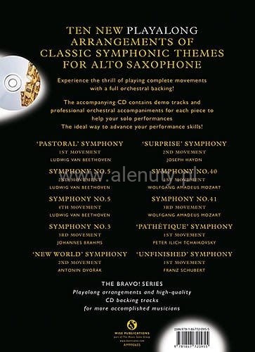 Pozycja z serii 'The Bravo! Series' zawiera wspaniałą kolekcję klasycznych tematów symfonicznych zaaranżowanych na saksofon altowy solo. Książka ta pozwoli doświadczyć niesamowitych emocji gry z akompaniamentem orkiestry zawartym na dołączonej płycie CD. Płyta zawiera również wersje demo wszystkich utworów.
