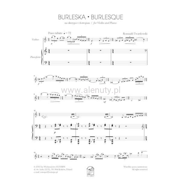 Romuald Twardowski skomponował Burleskę na skrzypce i fortepian w 1990 roku. Ta miniatura, o lekkim i pogodnym charakterze, nawiązuje do wcześniejszej kompozycji kompozytora - Capriccio in Blue z 1979 roku. W obu utworach można znaleźć elementy folkloru amerykańskiego i muzyki jazzowej. Utwór został prawykonany przez Sławomira Tomasika (skrzypce) oraz Barbarę Topolnicką (fortepian) w Warszawie 9 grudnia 1991 roku. Nuty na skrzypce i fortepian dla średnio-zaawansowanych.
