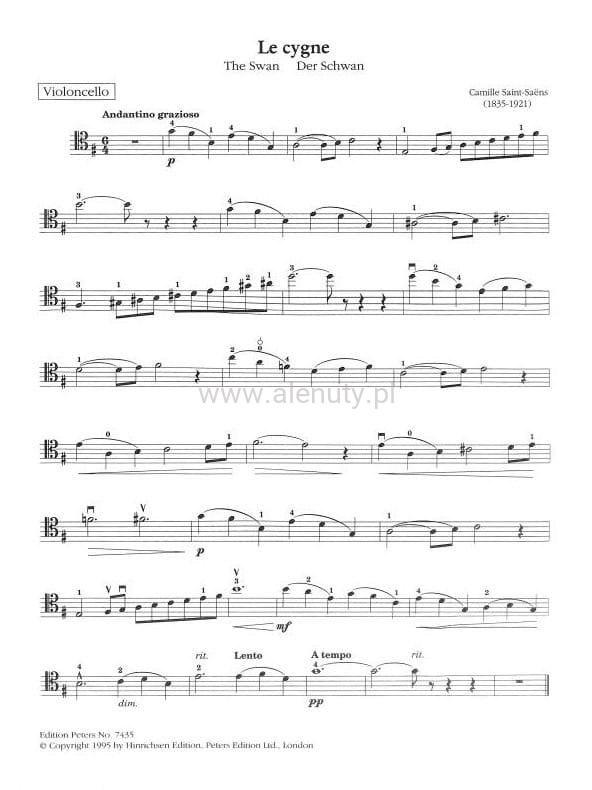 Camille Saint-Saens: Le Cygne - The Swan for Violoncello / Viola and Piano - Łabędź z Karnawału zwierząt - nuty na wiolonczelę lub altówkę z fortepianem