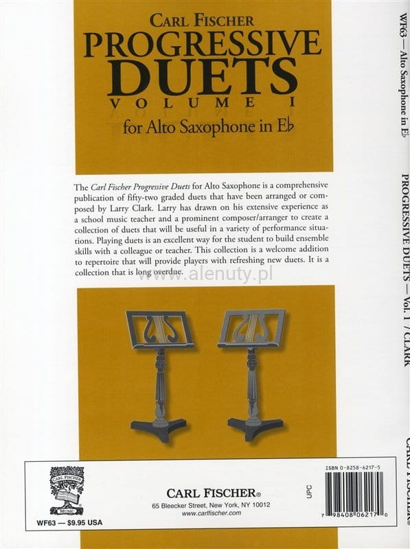 'Carl Fischer Progressive Duets 1 - Alto Saxophone' to pierwsza część dwutomowej, kompleksowej publikacji zawierającej duety na saksofon altowy. Wspaniała pozycja dla uczniów chcący budować i poszerzać swoje umiejętności poprzez grę w duecie z kolegą lub nauczycielem.