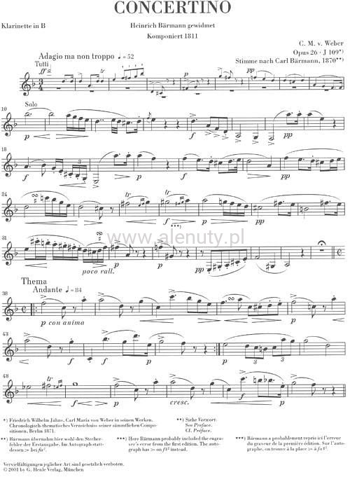 Carl Maria von Weber: Concertino op. 26 for Clarinet and Orchestra - nuty na klarnet i fortepian