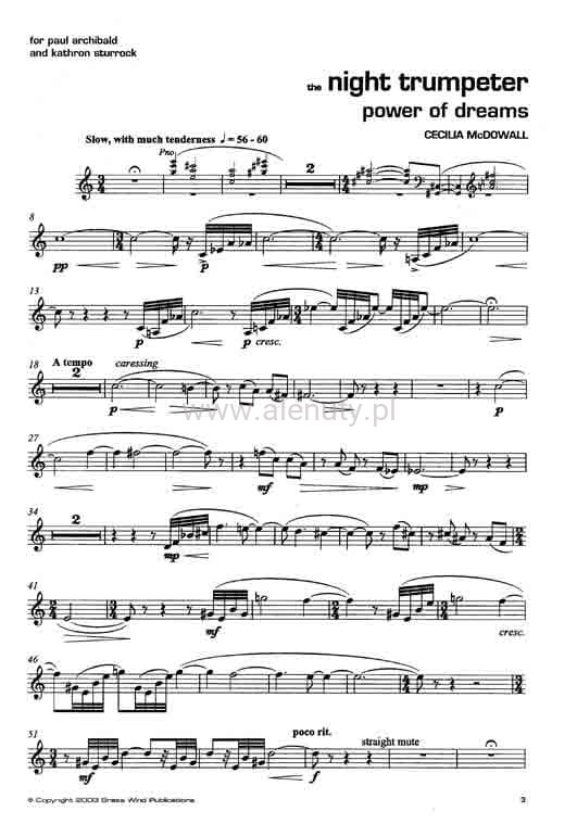 Cecilia McDowall studiowała na Uniwersytecie w Edynburgu, dalej kontynuowała studia w Trinity College of Music w Londynie, a następnie ukończyła MMus w zakresie kompozycji. Studiowała u Josepha Horovitza, Roberta Saxtona i Adama Gorba. Jest laureatką wielu nagród i siedmiokrotnie była nominowana do British Composer Awards. W 2014 roku zdobyła Brytyjską Nagrodę Kompozytorską. Utwór znajdujący się w tej publikacji jest klasykiem repertuaru tej artystki. Kontrastujące części są znakomicie napisane i owocują pokaźną i potężną pracą oraz koniecznością dla wszystkich trębaczy. Nuty na trąbkę i fortepian, dla średnio-zaawansowanych.