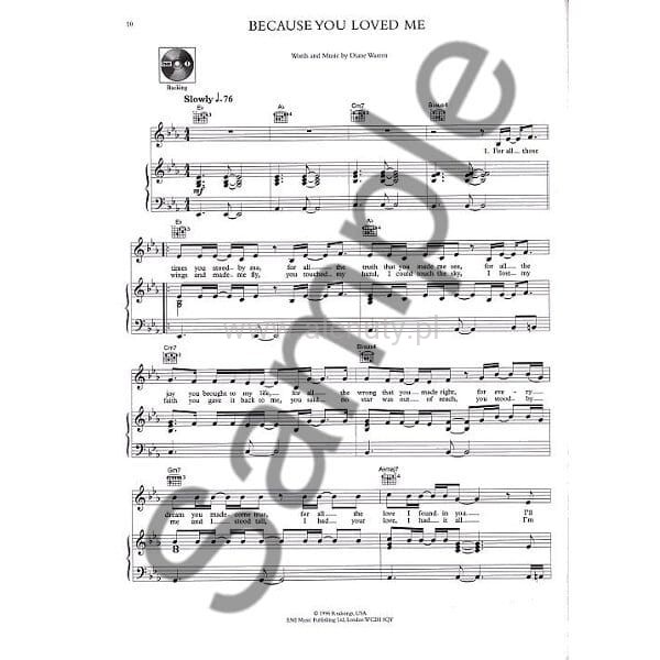 10 największych utworów w dorobku Celine Dion w aranżacji na fortepian, głos i gitarę (akordy). Kim jest Celine Dion - chyba wszyscy wiedzą. Znakomita wokalistka, kompozytorka i autoka tekstów o 5-oktawowym mezzosopranie. Książka opracowana w taki sposób, by jednocześnie mógł z niej korzystać zarówno gitarzysta, pianista jak i solista. Na stronie znajdują się nuty dla fortepianu i wokalu a powyżej zapisu nutowego umieszczone są akordy gitarowe wraz z diagramami. Każdy z utworów jest opracowany na fortepian, gitarę i wokal. Książka jest publikacją zagraniczną (anglojęzyczną), ale nie wymaga szczególnej znajomości języka angielskiego. Wstęp w języku angielskim.