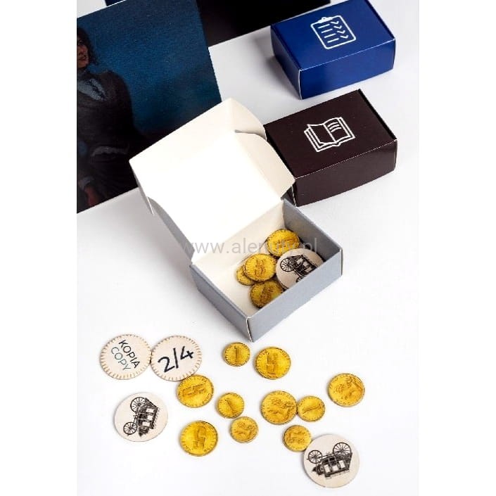 plansza o wymiarach 560x560 mm, 6 pionków drewnianych i znaczników, 6 kart postaci na podstawie obrazów Tomasza Wiktora wraz z parawanami, 110 kart akcji, 54 karty rękopisów, pudełeczka na monety, znaczniki postaci, żetony ruchu, instrukcja gry w języku: polski, angielski.