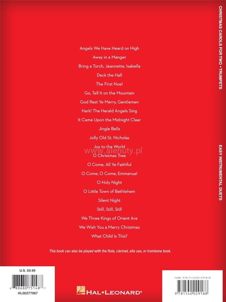Zbiór 22 kolędy i piosenek na Boże Narodzenie dla początkujących instrumentalistów zaaranżowane na dwie trąbki. Utwory można wykonywać mieszając instrumenty w duetach w ramach instrumentów z jednej grupy - dętych (trąbki, flety, puzony, klarnety, saksofony) lub smyczkowych (skrzypce z wiolonczelą). Nuty bardzo dobrze się sprawdzą w szkołach muzycznych 1 stopnia.