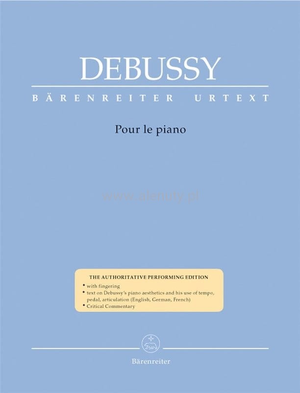 Little is known about the origins of Debussy’s Pour le piano, only that the second movement Sarabande was written in 1894 and that the autograph carries the clear inscription »1901«. As with the Suite bergamasque , Pour le piano was published first by Fromont in 1901, although Debussy did not grant him the full rights to the composition until 1905. This delay had most certainly to do with Debussy’s efforts to have Fromont transfer the rights to Pelléas et Mélisande to his new exclusive publisher Durand; in other words Fromont was to own Pour le piano only if Durand owned Pelléas . Bärenreiter’s new critical scholarly edition edited by Regina Back relies on all known sources, documenting the genesis of the composition, provides a detailed Critical Commentary and enlightens with its text passages on performance practice and Debussy’s piano music.