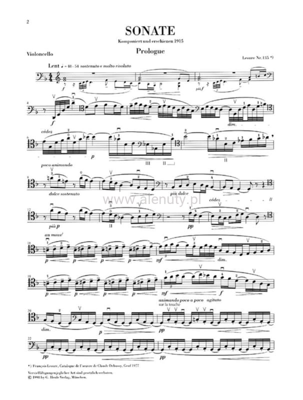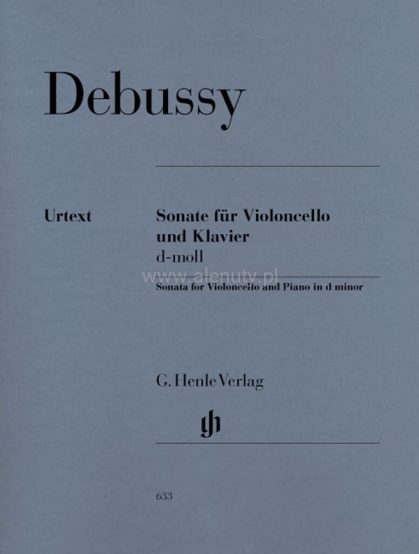 Tę sonatę wiolonczelową Debussy skomponował w 1915 roku. Podczas letnich wakacji nad morzem w Pourville. To sonata z niezwykłą sekwencją części Prologue-Sérénade-Finale została wydana w tym samym roku. Wydanie urtext. Nuty na wiolonczelę i fortepian dla zaawansowanych.
