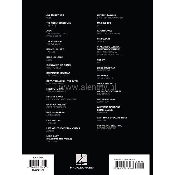Niemal 30 tematów z filmów i seriali (np. 'Avatar', 'Gra o tron', 'Downton Abbey') w prostej aranżacji na fortepian z dodana linią z tekstem oraz z chwytami gitarowymi. Książka opracowana w taki sposób, by jednocześnie mógł z niej korzystać zarówno gitarzysta, pianista jak i solista. Na stronie znajdują się nuty dla fortepianu i wokalu a powyżej zapisu nutowego umieszczone są akordy gitarowe wraz z diagramami. Książka jest publikacją zagraniczną (anglojęzyczną), ale nie wymaga szczególnej znajomości języka angielskiego. Wstęp w języku angielskim.