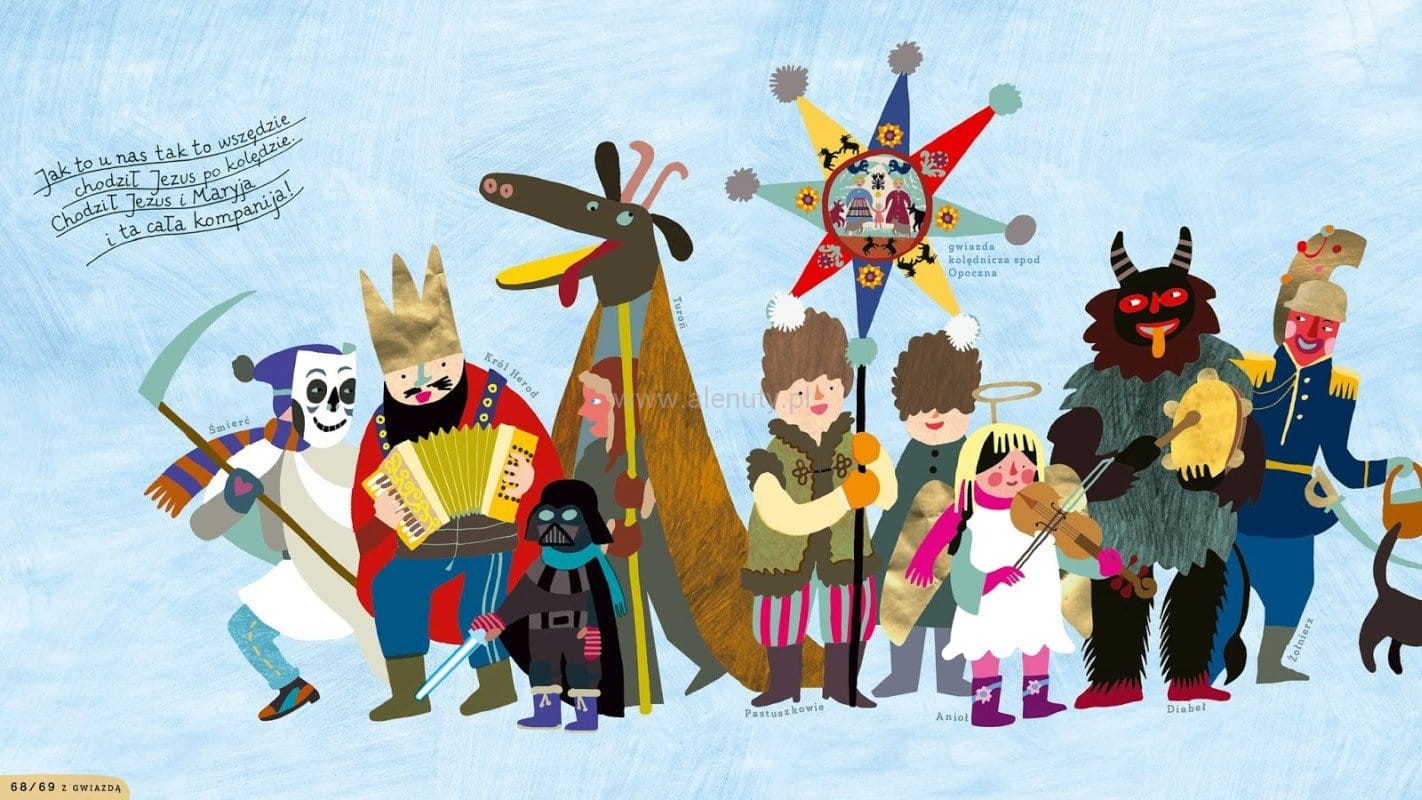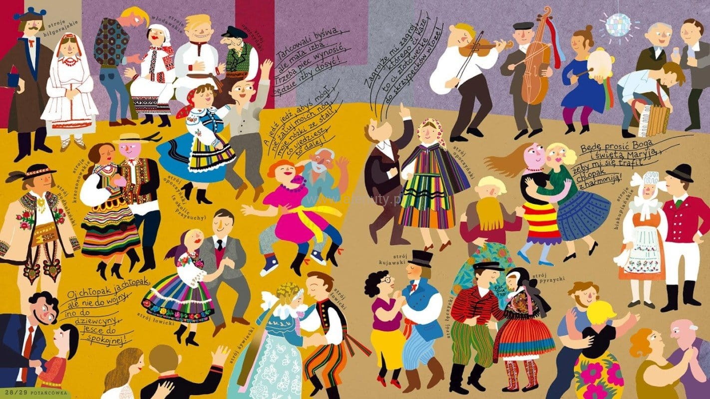 Na trzydziestu sześciu pięknie ilustrowanych tablicach autorka zrobiła przegląd tradycyjnych haftów, wycinanek, zabawek, strojów ludowych, dekoracji domowych, potraw, zwyczajów świątecznych, instrumentów muzycznych i innych elementów naszej polskiej kultury ludowej. Do obrazu zostało dodane oszczędne słowo, które jednak podaje czytelnikowi najciekawsze informacje o elementach polskiego folkloru. Barwne strony wzbogacone są także soczystymi fragmentami oryginalnych dawnych piosenek.