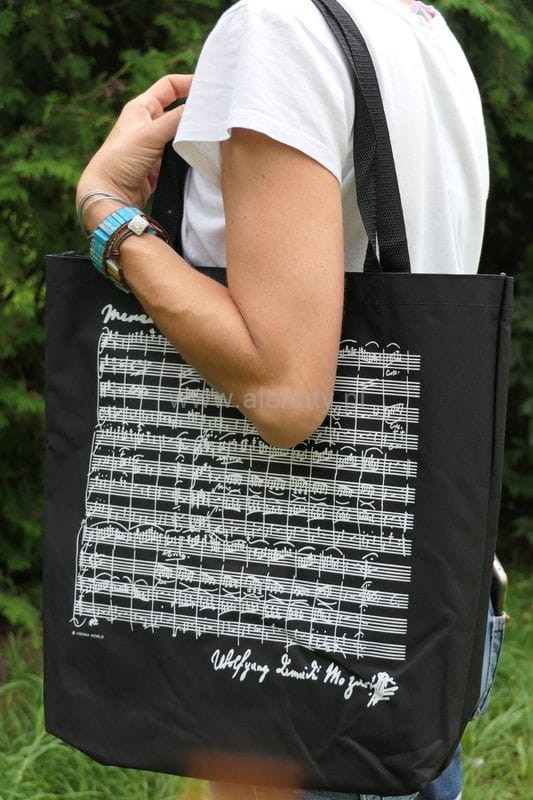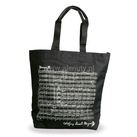Z Mozartem na zakupy? Ależ oczywiście. Czarna pojemna torba wykonana z dobrej jakości wytrzymałego płótna jest do tego wprost stworzona. Na obu bokach torby znajdziesz zapis nutowy jednego z utworów Mozarta. Dodatkowo torba jest foliowana od wewnątrz, co zabezpiecza zawartość przed przemoczeniem. Na środku posiada rzep pozwalający częściowo zamknąć torbę. Natomiast dzięki małe wewnętrznej kieszonce zamykanej na zamek błyskawiczny możesz bezpiecznie nosić w torbie portfel.