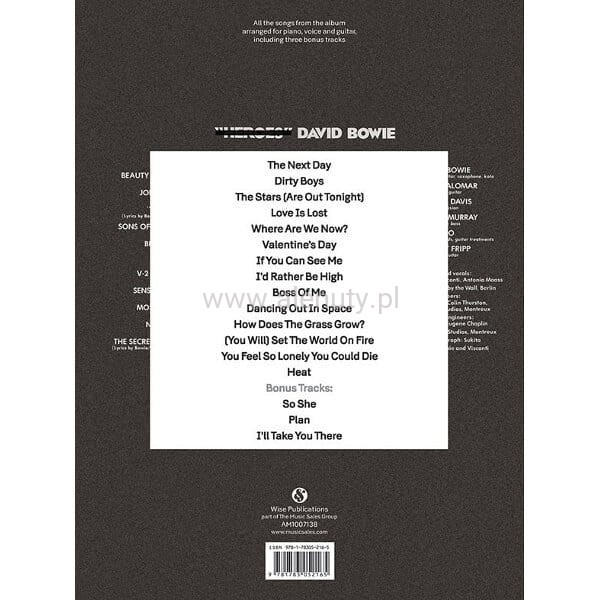 14 utworów + 3 dodatkowe z płyty "The Next Day" Davida Bowie w opracowaniu nutowym na fortepian i wokal wraz z tabulaturą dla średnio zaawansowanych. Każdy z utworów jest opracowany na fortepian, gitarę i wokal. Publikacja, została wydana z okazji 66. urodzin Davida ku zaskoczeniu jego fanów. Książka jest publikacją zagraniczną (anglojęzyczną), ale nie wymaga szczególnej znajomości języka angielskiego.