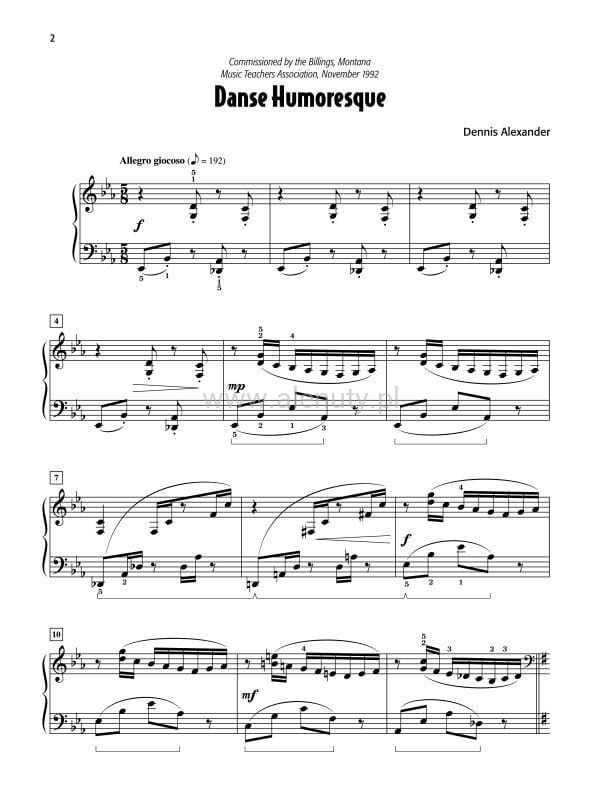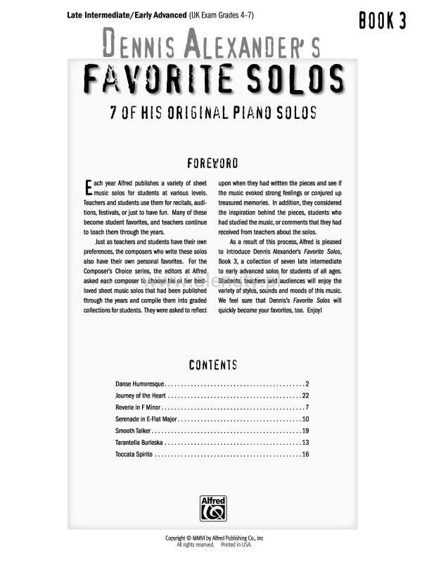 Treść tej książki została osobiście wybrana przez Dennisa Alexandra jako jego ulubione utwory solowe. Wiele z nich jest jednymi z najbardziej pożądanych zarówno przez nauczycieli gry na fortepianie, jak i uczniów. Zróżnicowane style każdego utworu sprawiają, że ta książka jest cennym uzupełnieniem większości metod pianistycznych. Ta książka zawiera utwory na poziomie średnio-zaawansowanym i zaawansowanym, nuty na fortepian.