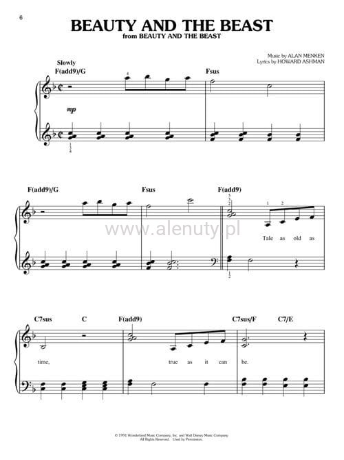 Piosenki o miłości z bajek Disneya - łatwe nuty na pianino i fortepian - spis utworów: