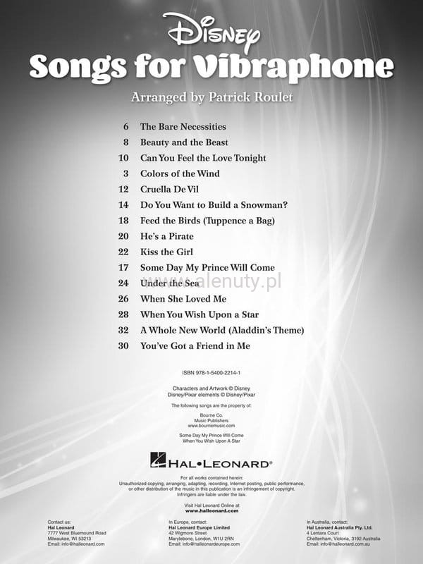 Disney Songs for Vibraphone - nuty na wibrafon - spis utworów: