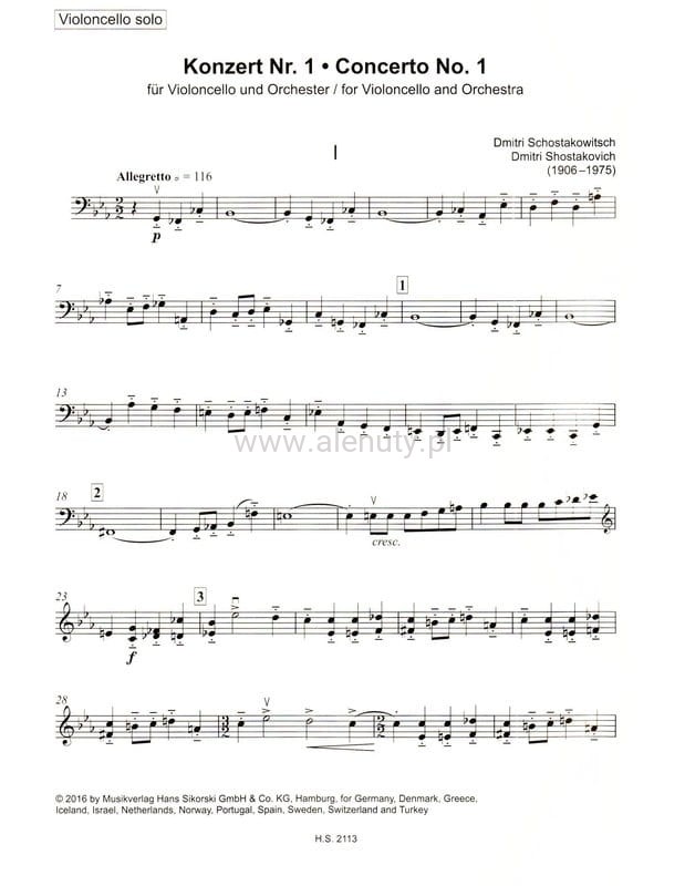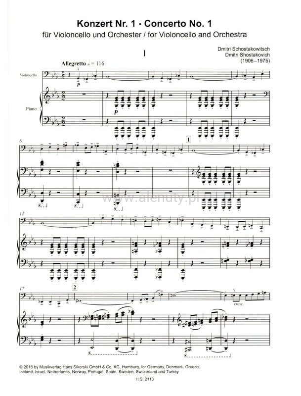 Dymitr Szostakowicz: Concerto No. 1 op. 107 for Violoncello and Orchestra - I Koncert wiolonczelowy Es-dur op. 107 - nuty na wiolonczelę i fortepian