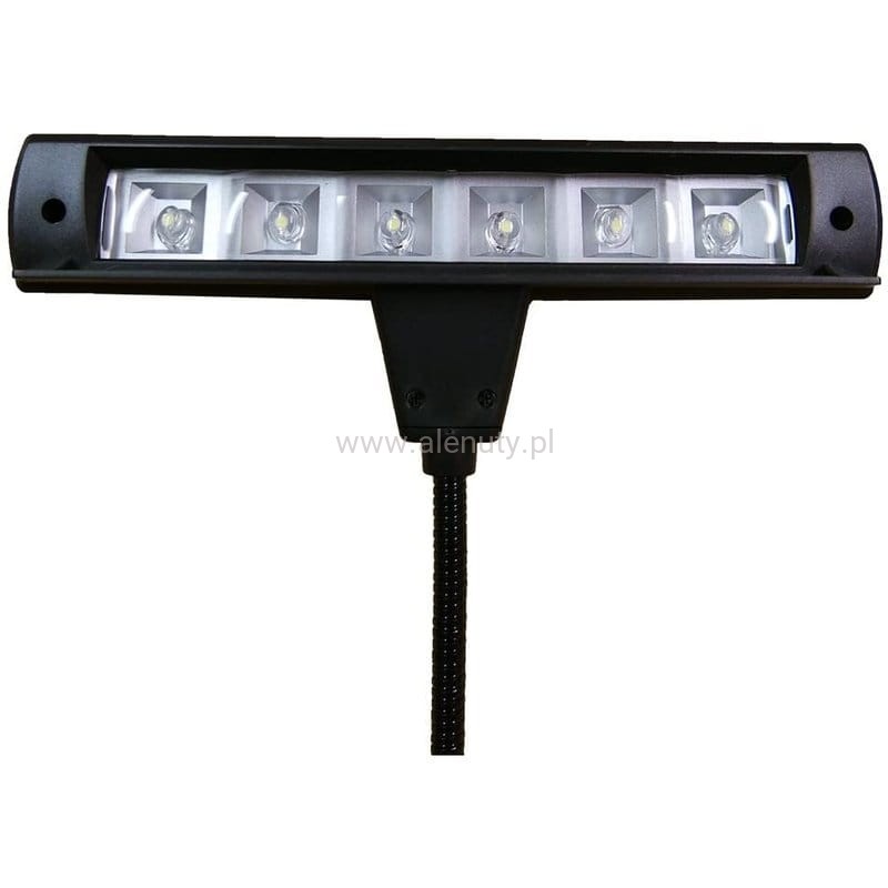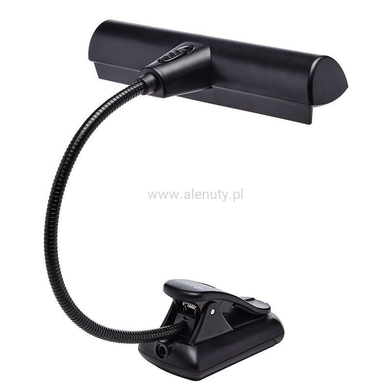 Pulpitowa lampka LED przeznaczona dla zespołów muzycznych i kameralistów - moc światła 55 lumenów, 6 diod LED, zaprojektowana na 100,000 godzin świecenia, w komplecie 3 baterie AAA, zasilacz i pokrowiec.