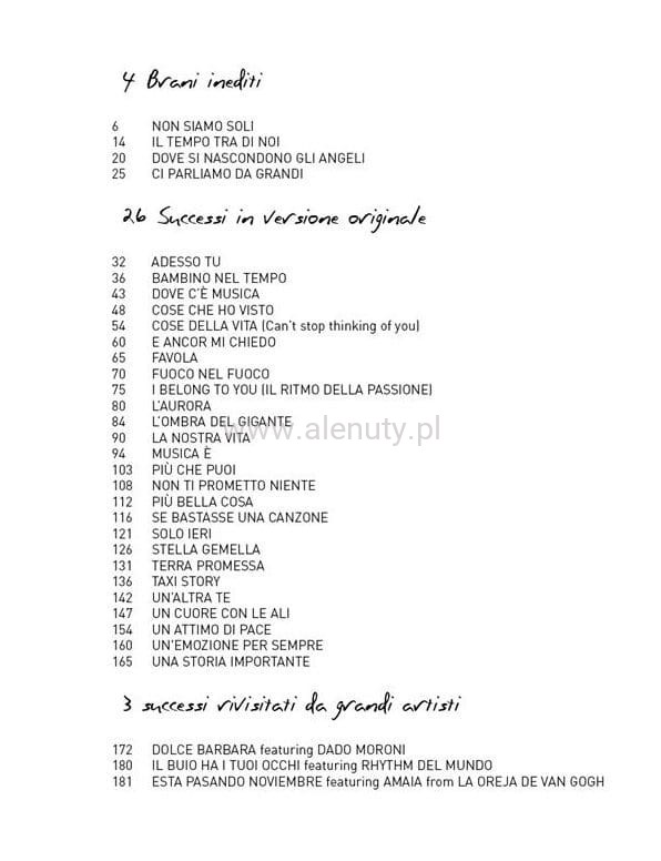 Kolekcja 33 największych hitów Erosa Ramazzotti w opracowaniu na fortepian, gitarę i głos. Wydania oznaczone jako PVG (Piano Vocal Guitar - Fortepian Melodia Gitara) zawierają zapis nutowy linii melodycznej, nuty na fortepian, akordy gitarowe oraz słowa do piosenek zamieszczonych w publikacji. Więcej o nutach PVG przeczytasz >>> w artykule