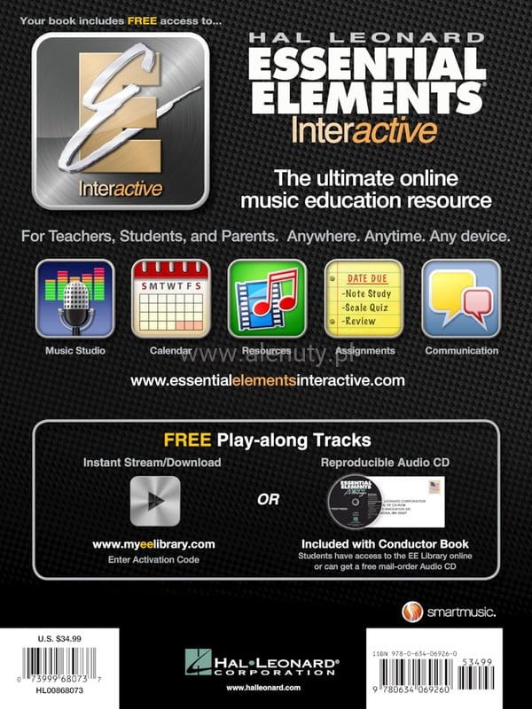 Do książki dołączony jest specjalny kod umożliwiający dostęp do muzycznej platformy internetowej Essential Elements. To wyjątkowe centrum zasobów stanowi łatwy zestaw narzędzi technologicznych do nauczania, uczenia się, oceny pracy i komunikacji z nauczycielem. To wszystko bez wychodzenia z domu! Dostęp obejmuje nagrane ćwiczenia w formie audio i wideo, lekcje i arkusze ćwiczeń z teorii muzyki, możliwość nagrywania i udostępniania własnej muzyki oraz wiele innych przydatnych funkcji. Więcej o korzystaniu z Essential Elements przeczytasz >>> tutaj