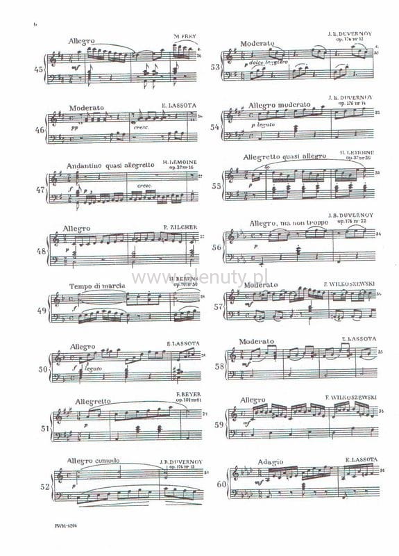 Utwory ułożone są według stopnia trudności, od najłatwiejszych (w pierwszej pozycji, przy zastosowaniu najprostszych schematów rytmicznych) do bardziej skomplikowanych (w różnych tonacjach, wymagających już większego zaawansowania technicznego).