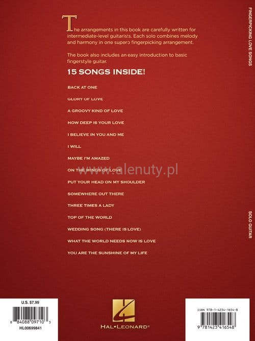 Pozycja z serii 'Hal Leonard Fingerpicking' zawiera kolekcję 15 najpiękniejszych piosenek o miłości zaaranżowanych na gitarę solo, w standardowym opracowaniu nutowym i tabulaturowym. Prezentowane aranżacje doskonale łączą melodie i harmonię w jedną doskonałą całość.