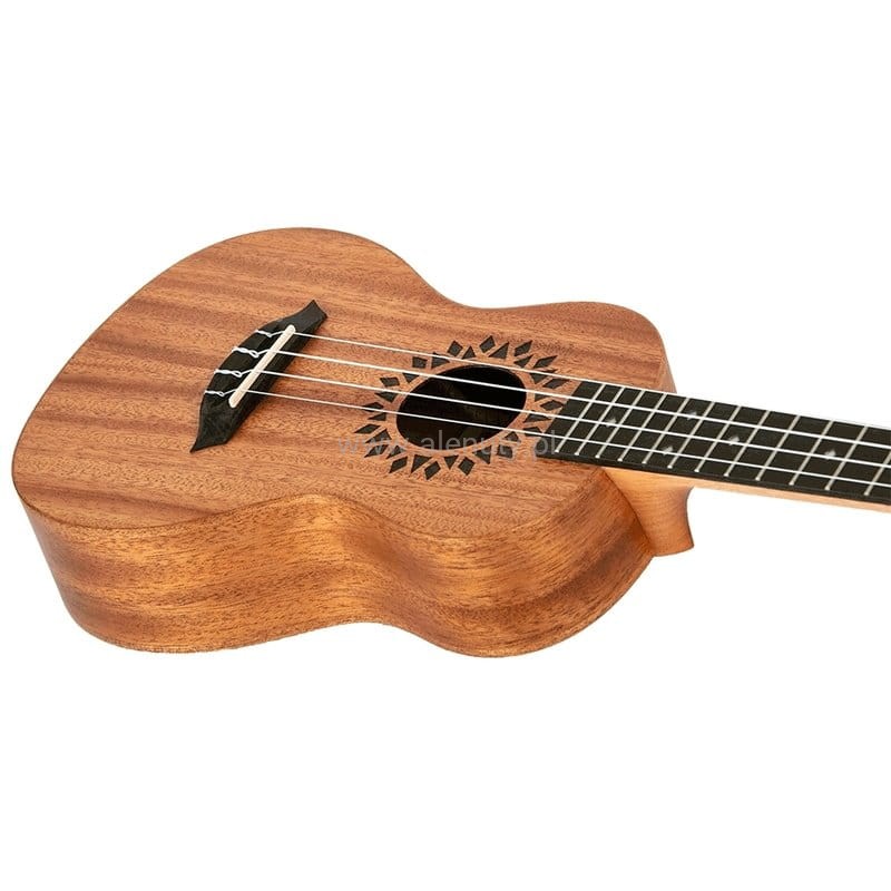Korpus tego ukulele jest wykonany z laminatu mahoniu, który jest twardym drewnem używanym od wieków do produkcji wysokiej jakości instrumentów muzycznych. Jego kolor może się znacznie różnić, od blado różowawego do ciemniejszego czerwonawo-brązowego i ma tendencję do ciemnienia wraz z wiekiem. Drewno mahoniowe słynie z jedwabistego, ciepłego odcienia. Elise zaprojektowała również odręczne wzory rozety, które przerobiono na ten piękny grawer laserowy.