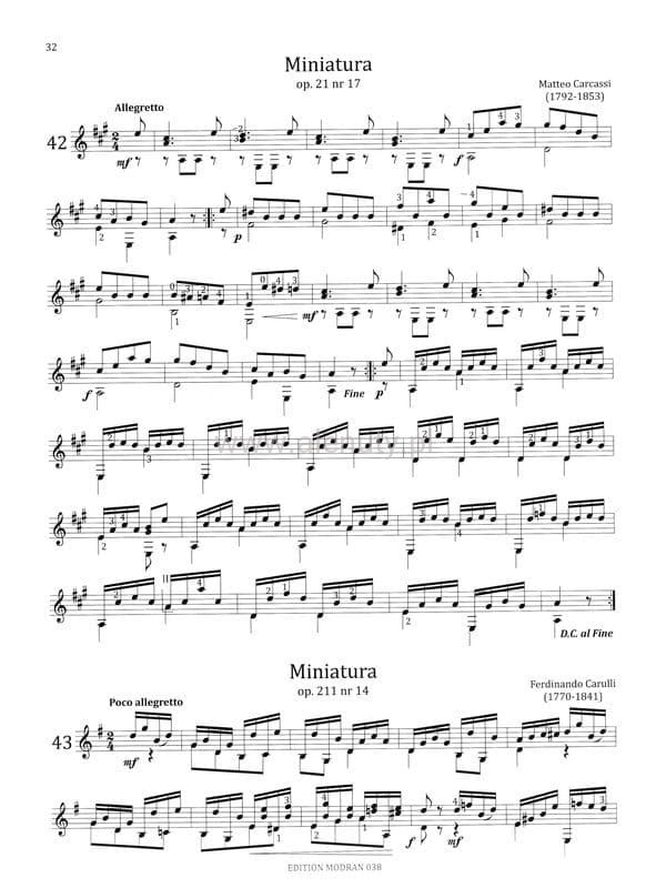 Tą publikację napisano, aby przybliżyć uczniów i nauczycieli szkół muzycznych I stopnia do muzyki klasycznej - zaznajomić z jej formą, fakturą, harmonią, melodyką i charakterem. Zawarte tu kompozycje to muzyczne perełki. Edukacja w oparciu o tego rodzaju materiał dydaktyczny uczy młodych gitarzystów właściwego rozumienia frazy, budowania kulminacji, kadencji i formy, uwrażliwia na piękną melodykę i harmonię. Ilość zawartych w książce utworów nie jest przypadkowa. W zamyśle cykl ten może towarzyszyć uczniom szkół muzycznych I stopnia przez wszystkie klasy, zatem kompozycje poukładane są od najłatwiejszych do najtrudniejszych, dziesięć na każdy rok nauki. Celowo pominięto etiudy, gdyż skupiają się one na kwestiach technicznych tymczasem prezentowane miniatury mają stanowić część repertuaru dowolnego adeptów sztuki gitarowej. W następujących po sobie utworach sugestii jest coraz mniej, ponieważ uczeń dysponuje już pewnym doświadczeniem i samodzielnie potrafi podejmować decyzje. Do opracowania wybranych utworów posłużyły ogólnodostępne wydania z przełomu XIX i XX wieku. Proponowane oznaczenia dynamiczne i gitarowe legata zostały zachowane, czasem uzupełnione. Drobne zmiany w sposobie zapisu faktury gitarowej nie wpływają na brzmienie utworów. Nuty na gitarę dla średnio-zaawansowanych.