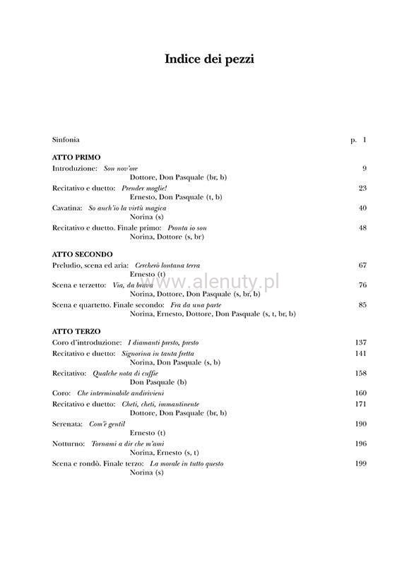 Publikacja zawiera kompletną partyturę wokalną dwuaktowej, opery buffa włoskiego kompozytora - Gaetano Donizettiego - Don Pasquale z librettem Giovanni Ruffini. Książka zawiera arie i duety, opracowanie na głos / głosy / chór z akompaniamentem fortepianu (wyciąg fortepianowy). Nuty dla zaawansowanych.