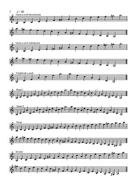 Opracowane ćwiczenia zawierają dwu oktawową gamę, trójdźwięki, progresje tercjowe i kwartowe. Gamy ułożone są według ilości znaków przykluczowych, ponadto molowe gamy zapisane są w odmianie harmonicznej oraz melodycznej. Dodatkowo na ostatniej stronie umieszczona jest gama chromatyczna w obrębie e – e3, a także dwie skale całotonowe.