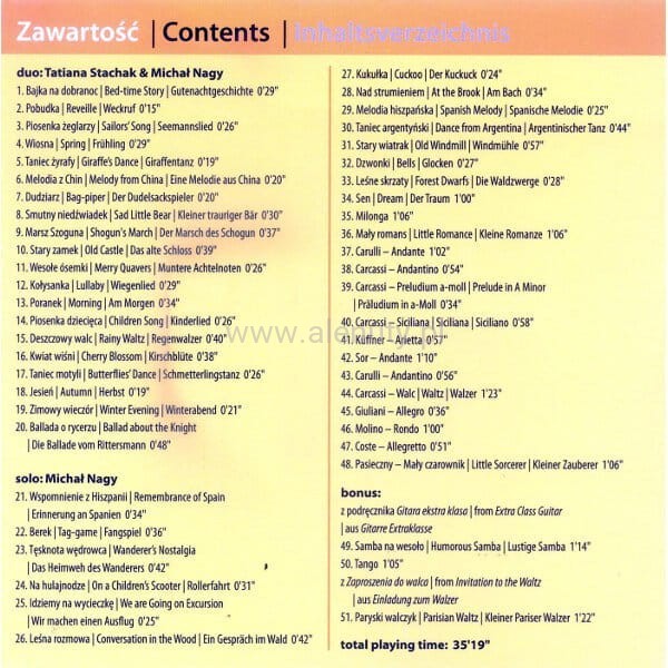 Płyta CD uzupełnienia podręcznik o tym samym tytule. To 36 kompozycji Tatiany Stachak z podręcznika Gitara pierwsza klasa, 12 kompozycji innych autorów z tej samej publikacji, a oraz trzy kompozycje Tatiany Stachak z publikacji Gitara ekstra klasa oraz Zaproszenie do walca. Wykonawcami utworów są Michał Nagy i Tatiana Stachak.