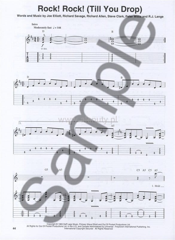 Pozycja z serii 'Guitar Play-Along' zawiera kolekcję 8 największych hitów zespołu Def Leppard w opracowaniu nutowym i tabulaturowym na gitarę elektryczną. Dodatkowo w książce znajdują się również teksty, linia melodyczna oraz akordy. Nuty la średnio-zaawansowanych, zaawansowanych.