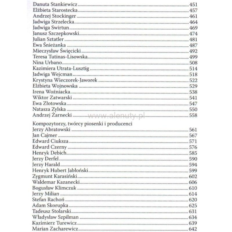 Publikacja zawiera biografie muzyczne i artystyczne, wywiady, zdjęcia, dyskografie. Przy opisie każdego artysty zamieszczono tekst piosenki wykonywanej w czasach największej świetności i sławy. Spis nazwisk artystów na skanach powyżej.