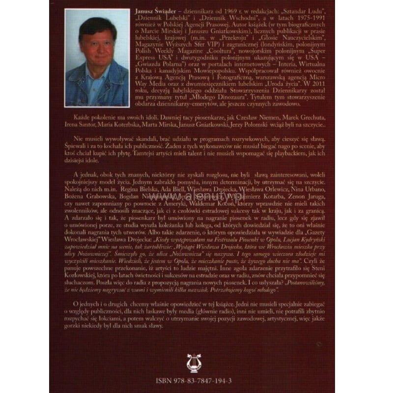 Książka ta stanowi obszerne wydanie encyklopedyczne zawierające opis 121 sylwetek piosenkarzy, kompozytorów oraz osób związanych z polską piosenką. Leksykon został stworzony po to, aby ocalić od zapomnienia przeszłość i pamiętać o artystach, którzy objawili się talentem.