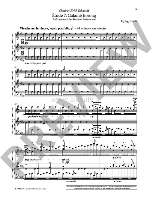 Podobnie jak w pierwszej części etiud Ligetiego, księga druga wymaga takiego samego poziomu umiejętności technicznych, aby wykonać niektóre z najbardziej wymagających utworów kompozytora. Dzięki zmiennym rytmom, nieregularnym interwałom i polimetrii stały się standardem w repertuarze fortepianowym tego artysty. Opracowanie zawiera nuty na fortepian solo, dla średnio-zaawansowanych i zaawansowanych.