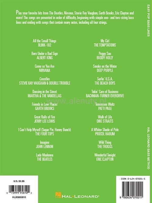 Nuty na gitarę basową 20 łatwych linii basowych z popularnych piosenek, o narastającym poziomie trudności. Zbiór ten dobrze uzupełnia się z pierwszym tomem szkoły gry na gitarze basowej Hal Leonard Bass Method. W cenie nut jest dostęp do nagrań utworów i podkładów dźwiękowych na stronie wydawcy.