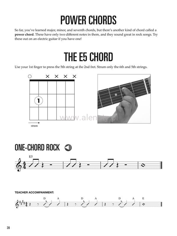 Szkoła gitary elektrycznej dla dzieci to łatwy i przyjemny kurs, który uczy dzieci gry na gitarze szybciej niż kiedykolwiek wcześniej. Popularne piosenki motywują uczniów, a przejrzyste, proste układy zapewniają, że ich uwaga pozostaje skupiona na danej koncepcji. Metoda jest odpowiednia dla uczniów używających gitar elektrycznych oraz akustycznych. Książka może być świetnym materiałem, z którego korzystają nauczyciele gry na gitarze ale może służyć także do samodzielnej nauki. Dołączony do książki kod audio online zapewni dostęp do utworów demo. Opracowanie dla początkujących.