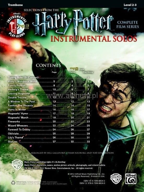 Ta książka jest jedną z części serii Harry Potter Instrumental Solos zaaranżowanej na flet, klarnet, saksofon altowy, saksofon tenorowy, trąbkę, róg (waltornia), puzon i opcjonalny akompaniament fortepianowy. Wszystkie aranżacje instrumentów dętych są w pełni kompatybilne i mogą być z powodzeniem wykonywane jako utwory solo lub na zespół. Dołączona do książki płyta CD zawiera akompaniament, a także ścieżki demonstracyjne każdego utworu. Nuty dla średnio-zaawansowanych.