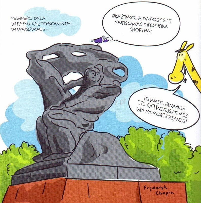 Żyrafa Grażynka i ptaszek Gwarek krok po kroku poprowadzą cię, a jeśli będziesz postępować zgodnie z ich instrukcją na twojej kartce pojawi się nie kto inny, ale sam Fryderyk Chopin!