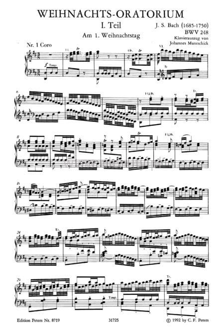 Wydanie 'Weihnachtsoratorium' BWV 248 (Oratorium na Boże Narodzenie) autorstwa J. S. Bacha, niemieckiego kompozytora późnobarokowego. Są to nuty na chór (SATB) i fortepian (wyciąg, oryginalnie na orkiestrę).