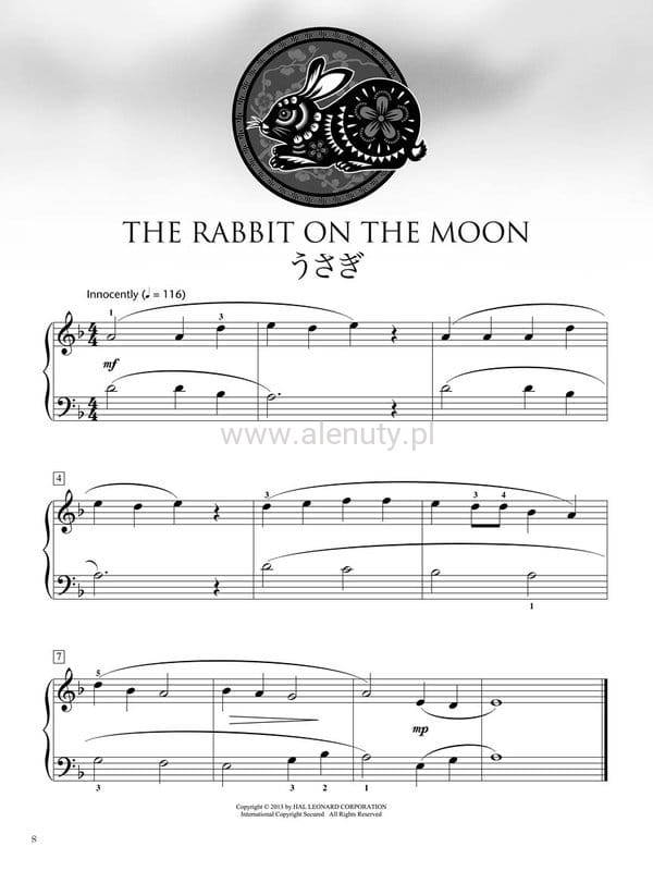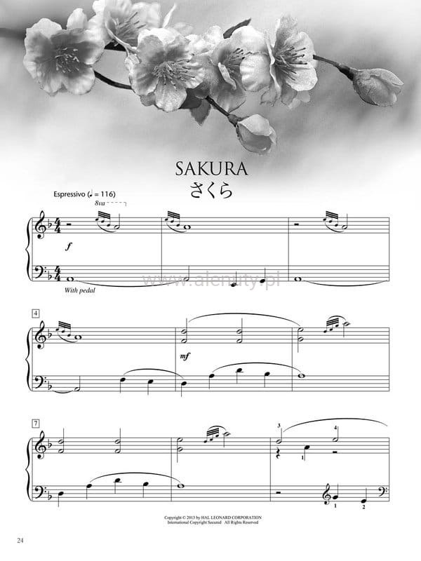 Publikacja zawiera 24 tradycyjne pieśni ludowe na fortepian solo nawiązujące do kultury i muzyki świata japońskiego. Zawiera notatki dotyczące pieśni ludowych, ilustracje oraz mapę regionu. Nuty dla średnio-zaawansowanych.