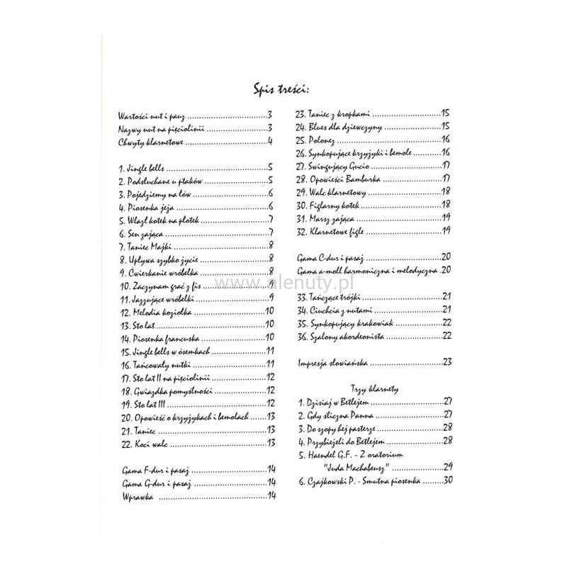 Kolekcja 36 utworów w opracowaniu nutowym na klarnet oraz 6 utworów na 3 klarnety. Dodatkowo książka zawiera również krótkie informacje na temat wartości nut i pauz, nazw nut na pięciolinii oraz chwyty klarnetowe. Zobacz pozostałe nuty na klarnet dla początkujących!