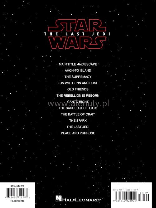 Nuty na fortepian zbioru utworów z filmu 'Star Wars: The Last Jedi' (Gwiezdne wojny: Ostatni Jedi), w aranżacji zatwierdzonej przez kompozytora, Johna Williamsa.
