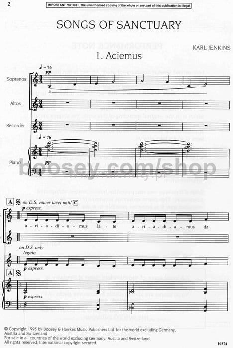 Aranżacja pierwszego utworu ze zbioru 'Songs of Sanctuary' Karla Jenkinsa, 'Adiemus', na chór żeński SSAA, flet prosty i fortepian. Jest to dzieło czerpiące z europejskiej tradycji muzycznej, o pięknym, spokojnym brzmieniu i głębokiej harmonii. Wyjątkowe dla zbioru jest to, że śpiewacy nie śpiewają prawdziwych słów, lecz sylaby dobrane przez kompozytora, tak aby jak najmniej przeszkadzały, a śpiew traktowany jest instrumentalnie.