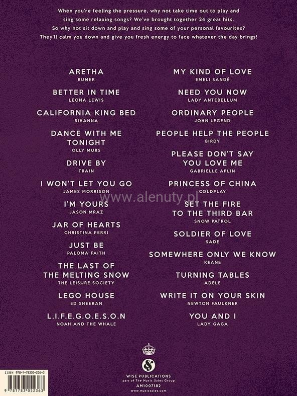 Kiedy czujesz presję, dlaczego nie poświęcić czasu na zabawę i zaśpiewanie dobrych piosenek w towarzystwie fortepianu i gitary? Ten śpiewnik zawiera 28 klasyków, od ballad miłosnych, po inspirujące hymny. Dlaczego więc nie usiąść, zagrać i zaśpiewać swoje ulubione utwory? Uspokoją Cię i dodadzą świeżej energii do stawienia czoła temu, co przyniesie dzień. Opracowanie zawiera nuty na fortepian, głos i gitarę dla średnio-zaawansowanych.