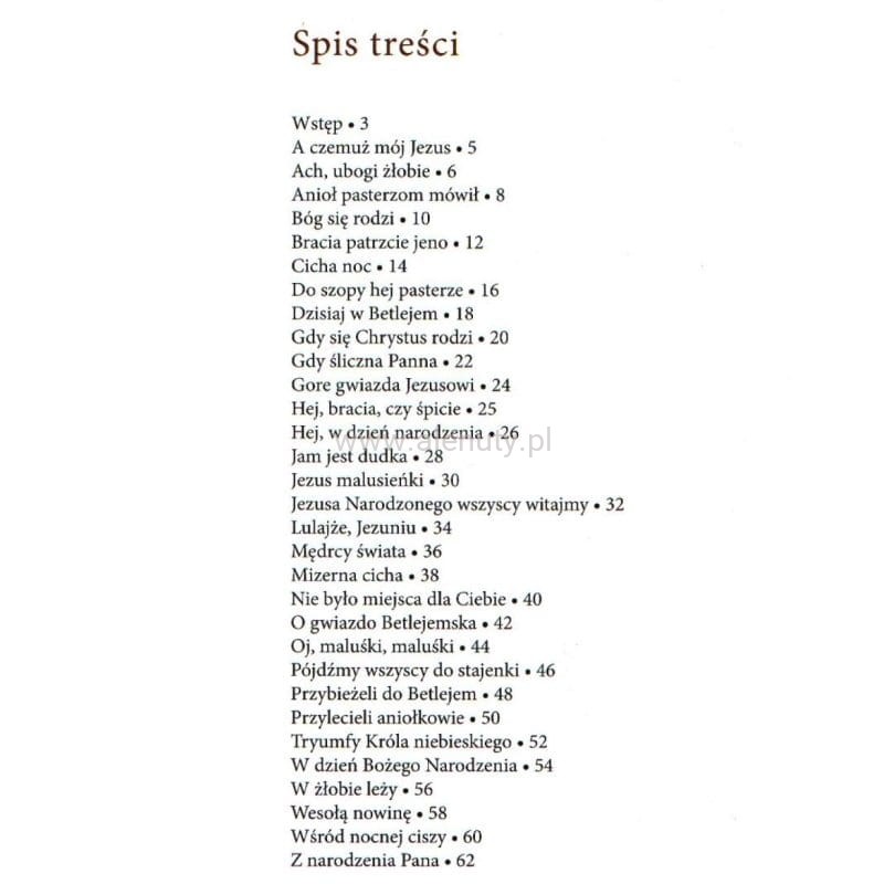 30 najpiękniejszych kolęd z zapisem nutowym, chwytami gitarowymi i pełnymi tekstami. Śpiewnik jest pięknie wydany na papierze kredowym z kolorowymi ilustracjami. Dodatkowo do śpiewnika załączona została płyta CD, na której znajdują się artystyczne wykonania kolęd zawartych w zbiorze.