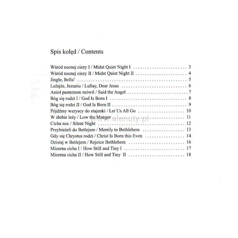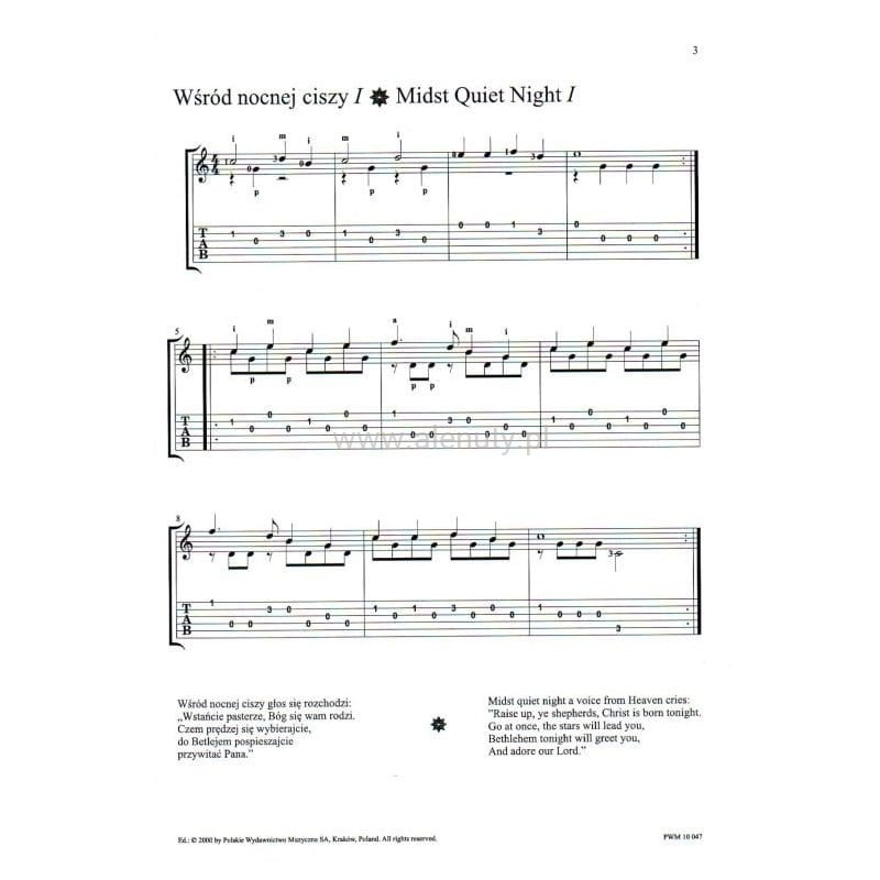 Zbiór kolęd przygotowany z myślą o osobach rozpoczynających naukę gry na gitarze. Dodatkowo zamieszczony pod nutami zapis tabulaturowy, pozwala na zagranie kolęd również gitarzystom, którzy nie znają zapisu nutowego. Z myślą o obcokrajowcach, obok zwrotki w języku polskim pojawia się przekład angielski słów. Nuty dla początkujących.