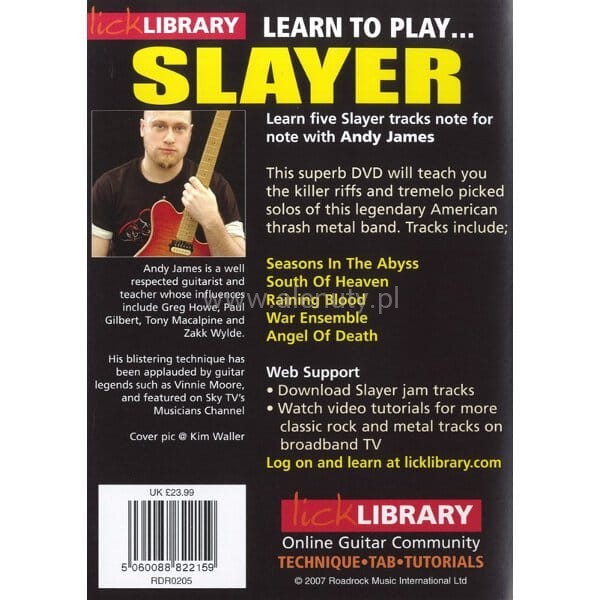 Znakomita szkoła DVD, zawierająca pięć utworów zespołu thrash metalowego Slayer. Dzięki wyjątkowym lekcjom z Andy James nauczysz się niesamowitych riffów, zagrywek i solówek, a brzmienie twojej gitary naprawdę nabierze mocy. Na DVD znajdziesz także dokładne transkrypcje pięciu największych przebojów zespołu.