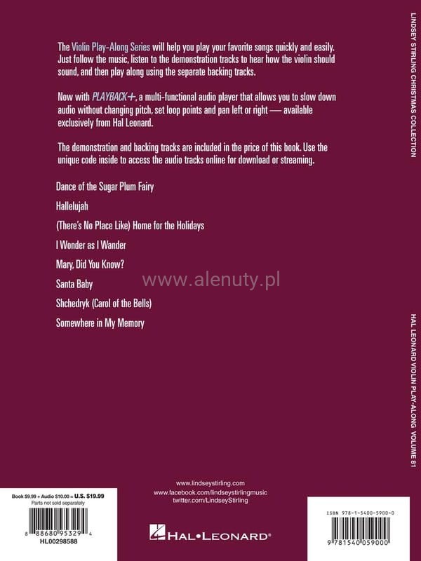 Seria Violin Play-Along pomoże Ci łatwo zagrać na skrzypcach ulubione piosenki o tematyce świątecznej. Lindsey Stirling – amerykańska skrzypaczka, piosenkarka, tancerka. Lubi eksperymentować w swojej twórczości muzycznej łącząc ze sobą gatunki muzyczne, takie jak hip-hop oraz dubstep. W tej publikacji Lindsey prezentuje swoje świąteczne nagrania. Pliki audio dostępne online pozwalają na odsłuchanie ścieżek demo każdego utworu oraz wykonanie ich razem z podkładem. Aranżacja na skrzypce, nuty dla średnio-zaawansowanych.